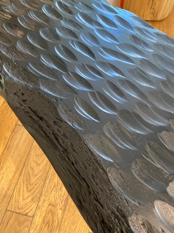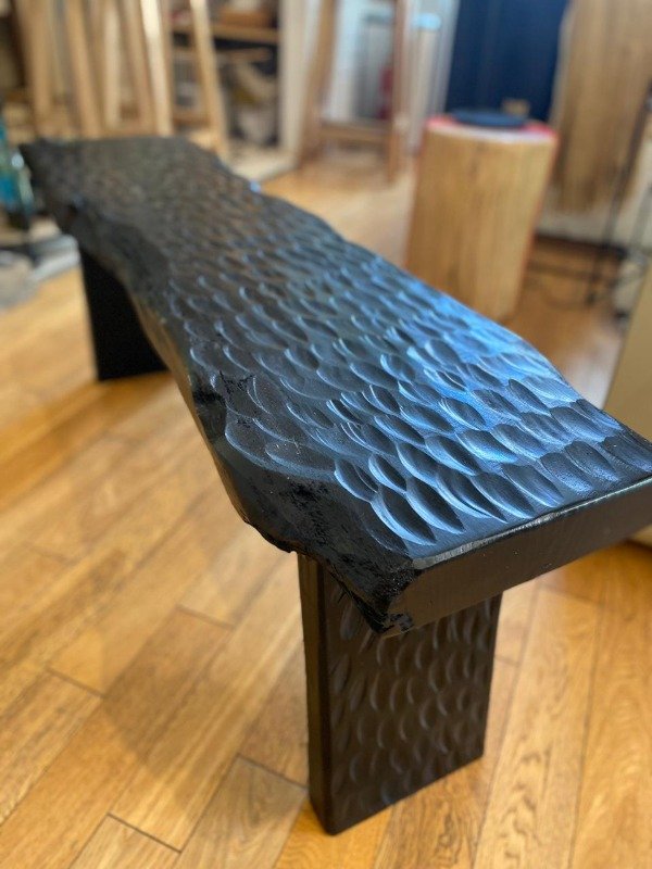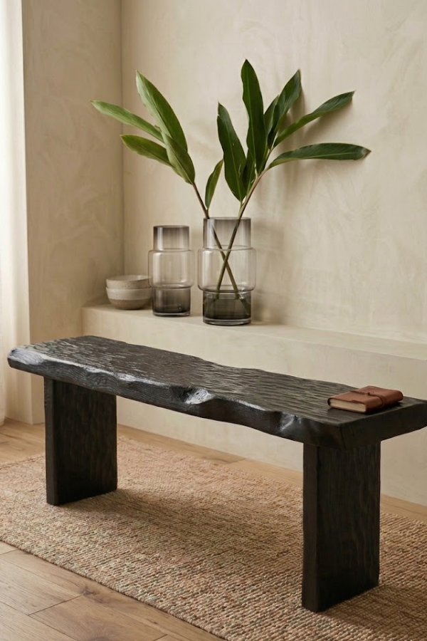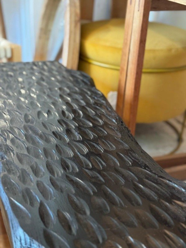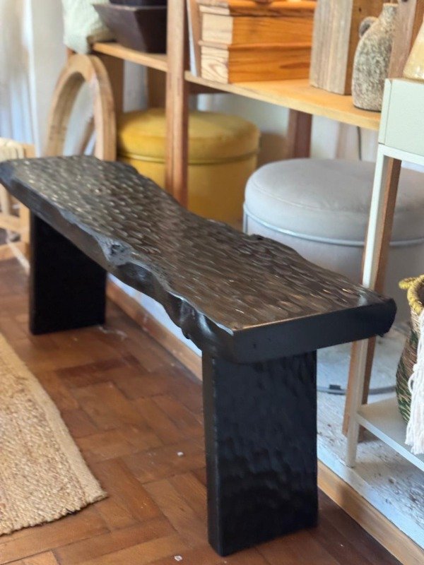 Banco realizado en madera maciza devastada con terminación en color negro. Diseño exclusivo de Casa Flo Tolosa.