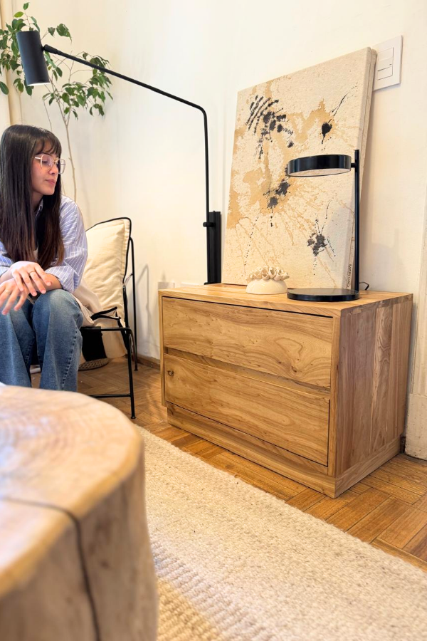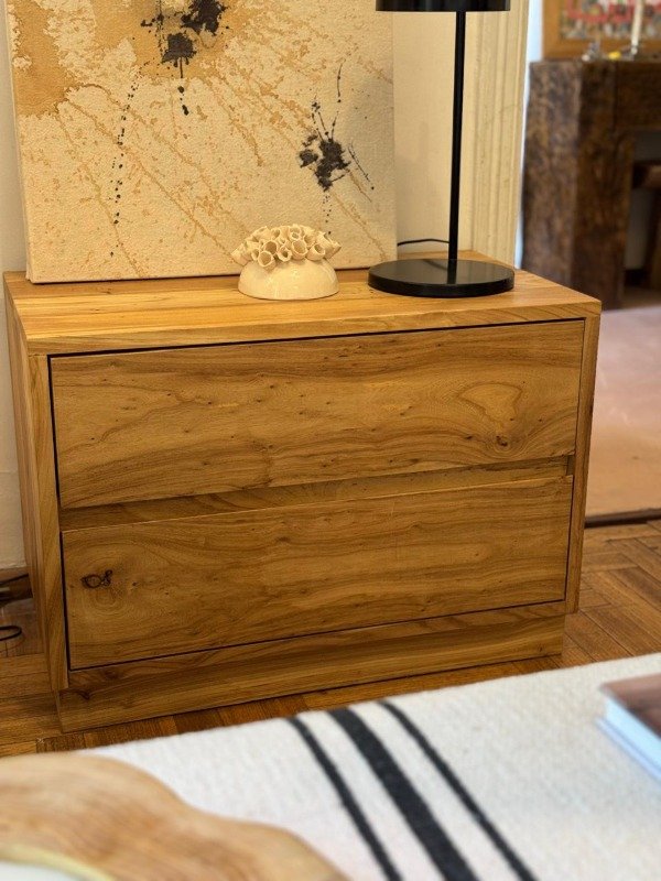 Mesa de luz con corredora telescópica realizada en madera maciza de Olmo.
