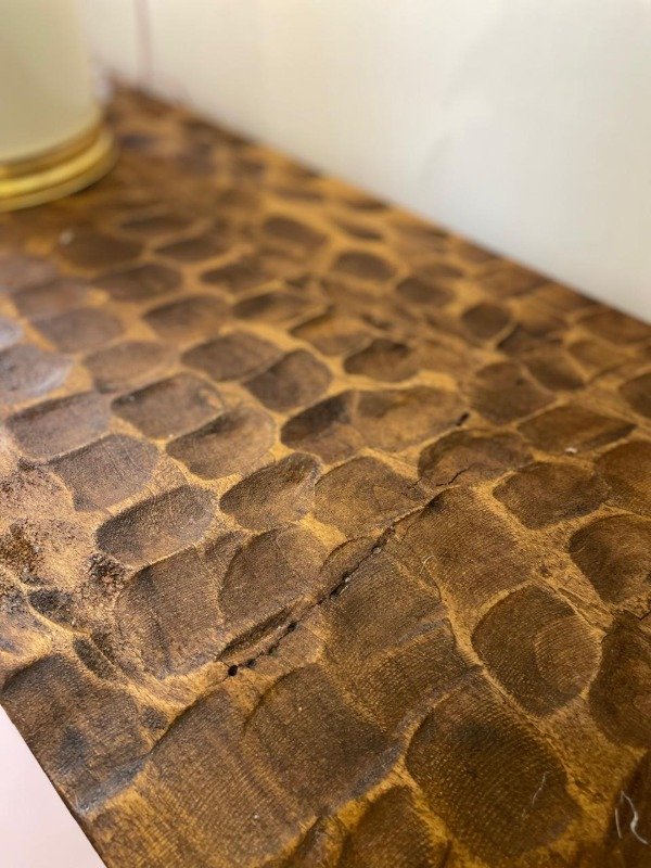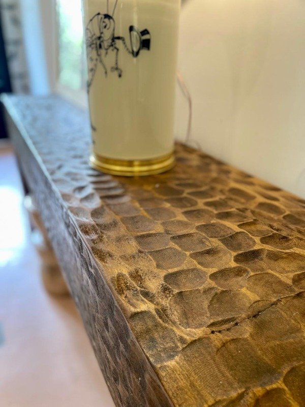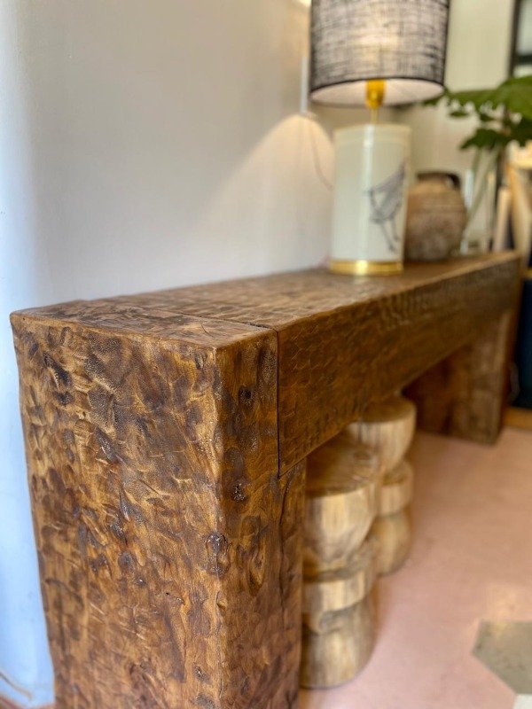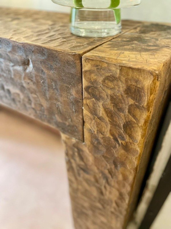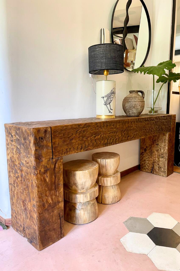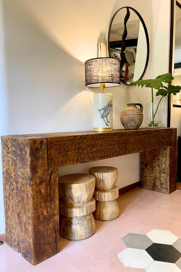 Recibidor en madera maciza devastada con tinte en nogal claro. Diseño esclusivo de Casa Flo Tolosa.