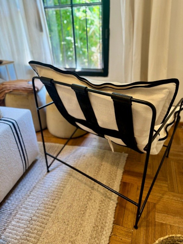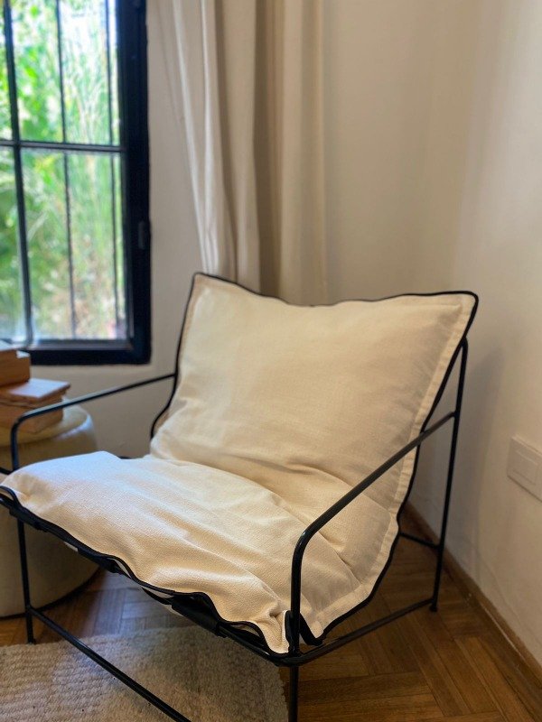 Sillón con estructura de hierro macizo y asiento de cuero 100% con almohadon de lino natural relleno de vellon siliconado.
