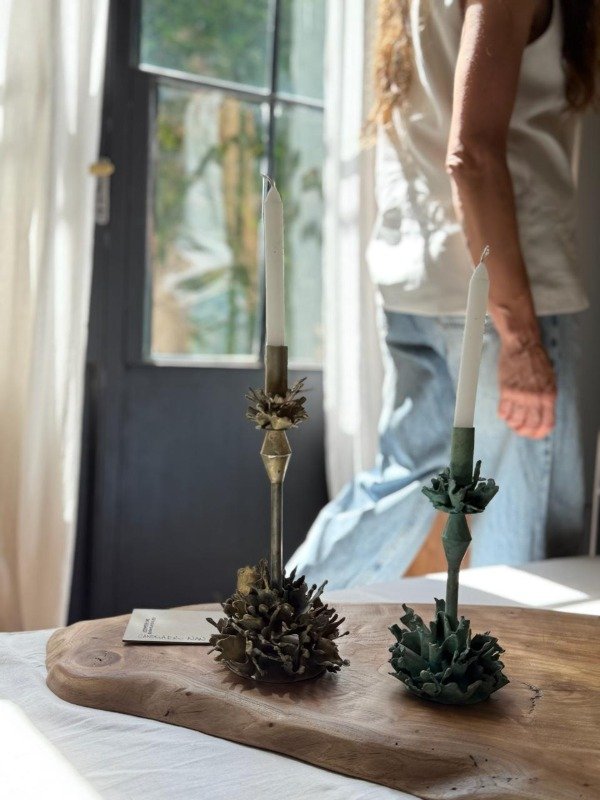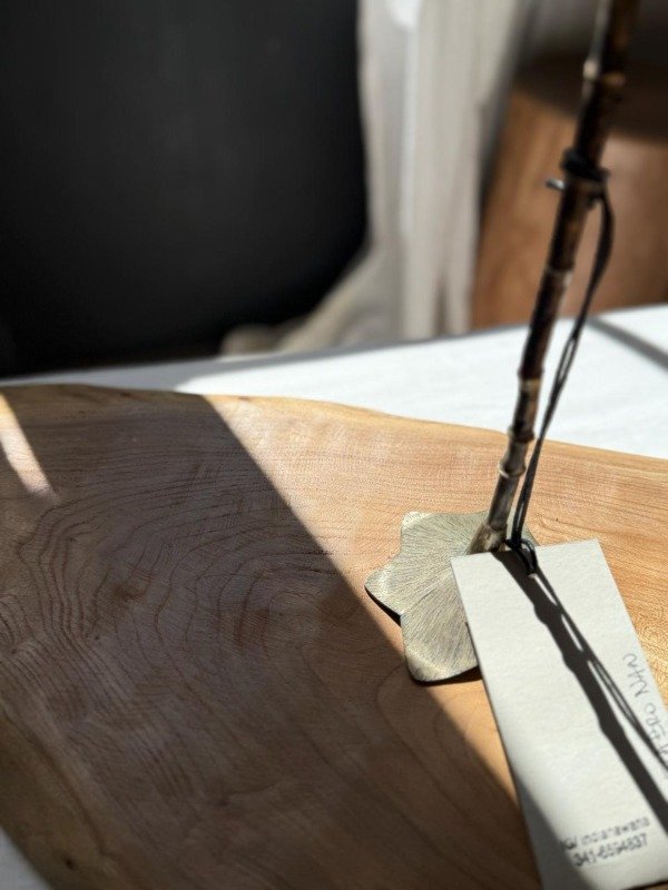 Candelabro desarrollado en alpaca sobre madera recuperada.