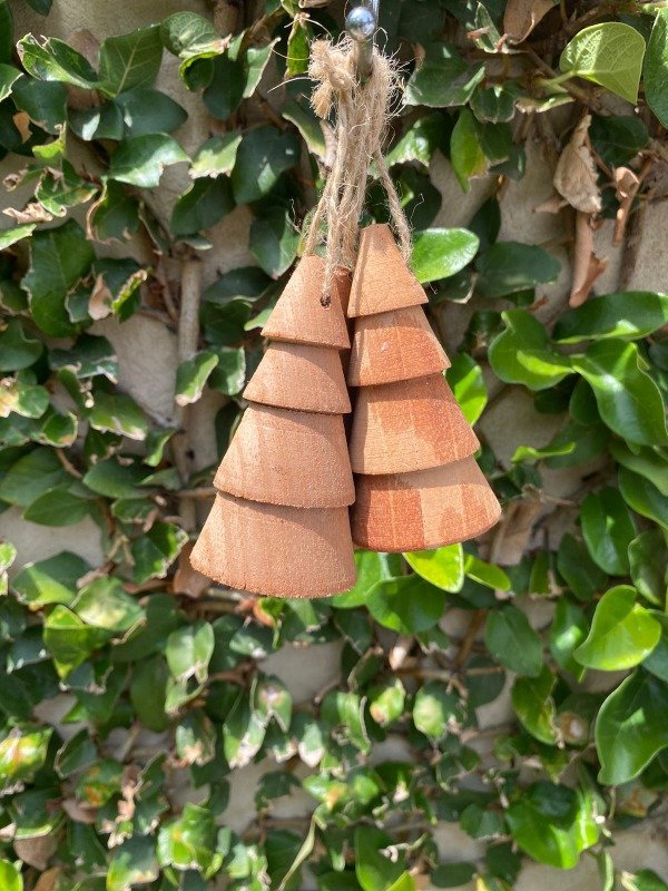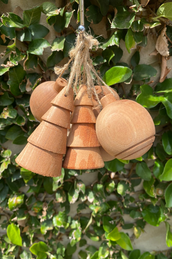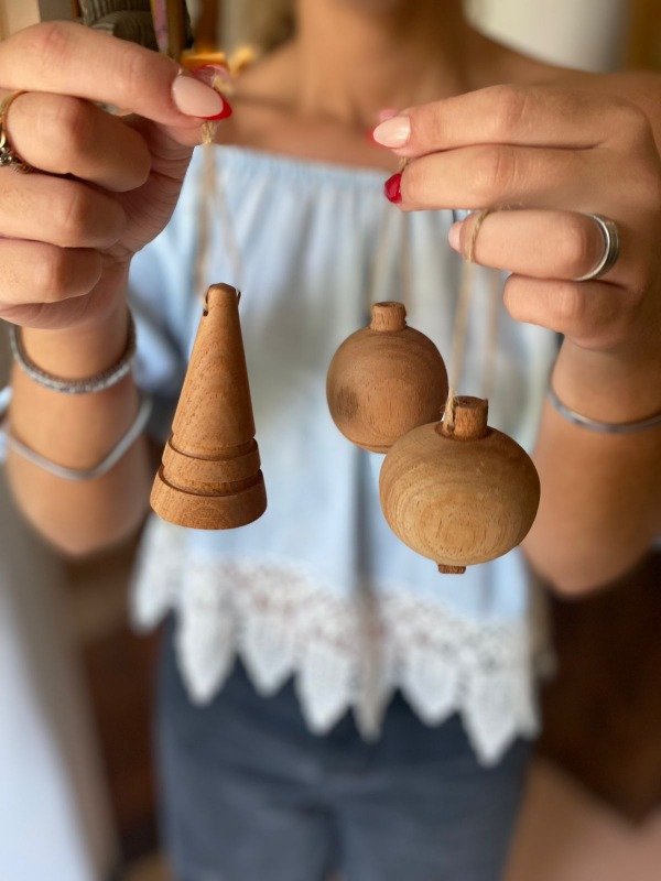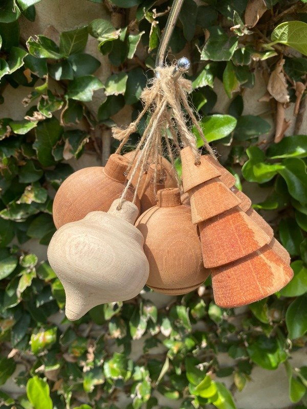 Cada bolsita de lienzo incluye mix de adornos navideños como pinitos y borlas de madera maciza torneada.